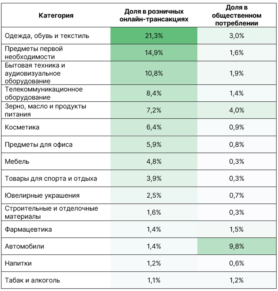 В меньшей степени через онлайн-каналы продаются автомобили, которые традиционно реализуются через офлайн-каналы. Также через ecommerce реже продаются напитки, лекарства, а также табачная и алкогольная продукция (продвижение последних в целом находится под жесткой цензурой). Хотя и для данных категорий есть свои нишевые площадки, например, маркетплейс 1919, который специализируется на винных продуктах.