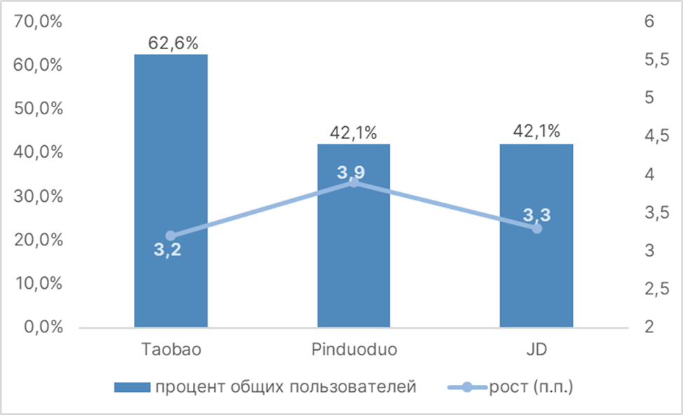 Интересная особенность заключается в том, что соцсети и маркетплейсы, несмотря на рост конкуренции, становятся все более связаны друг с другом своей аудиторией. Например, совместная аудитория Taobao и Douyin в декабре 2023 года составила 651 млн человек (62,3% от общего трафика обеих площадок), высокий процент общей с Douyin аудитории также характерен и для Pinduoduo и JD. Более того, такие значимые пересечения существуют и для других комбинаций маркетплейсов и соцсетей.