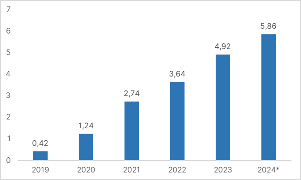 Если в 2019 году рынок livestream электронной коммерции в Китае составил 0,42 трлн юаней, то к концу 2023 года он вырос почти в 12 раз до 4,92 трлн юаней. По оценкам iResearch, в ближайшие годы можно ожидать дальнейшего роста индустрии, в частности, в 2024 году рынок может вырасти до 5,86 трлн юаней.