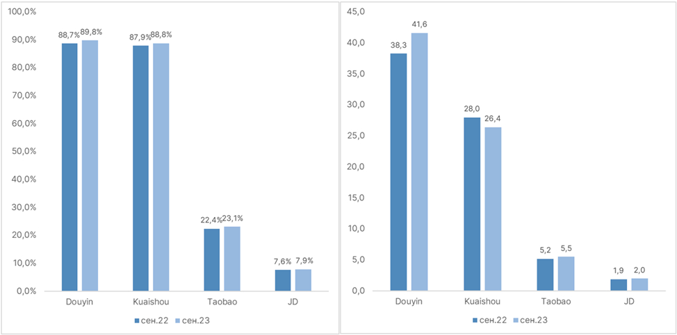 Если в сентябре 2023 года порядка 89-90% пользователей этих площадок смотрели лайвстримы, то для традиционных маркетплейсов Taobao (Tmall) и JD этот показатель составил лишь 23,1% и 7,9% соответственно. Douyin и Kuaishou полагаются на свои собственные сильные стороны в развлекательных возможностях и интерактивности для аудитории, изначально более присущих им в отличие от маркетплейсов.