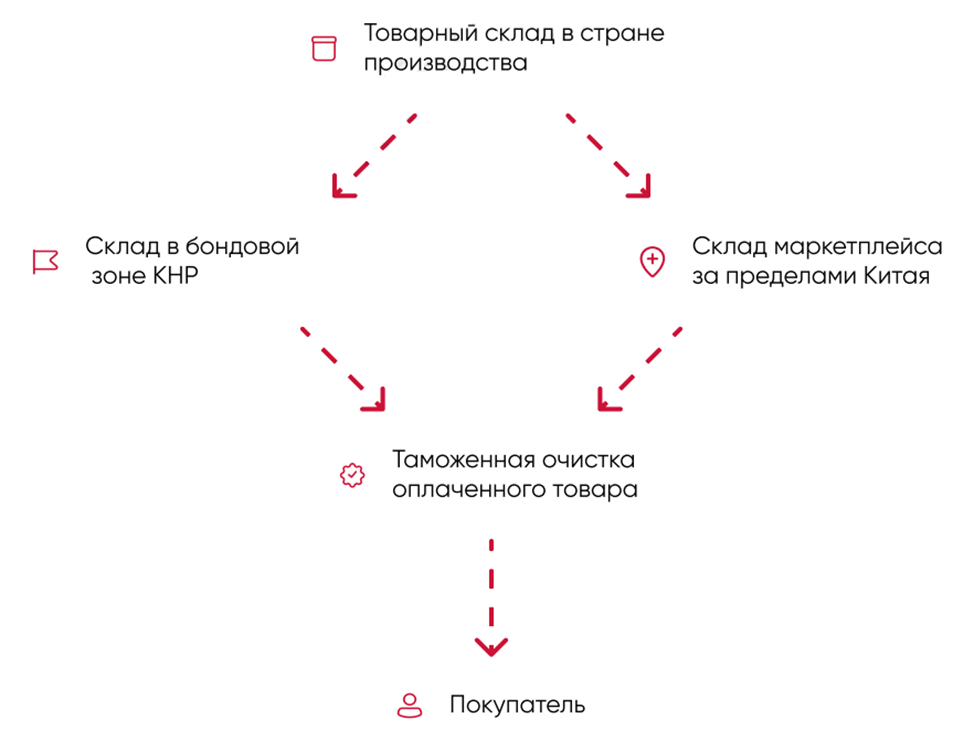 В условиях развития cross-border e-commerce решений от китайских маркетплейсов процесс выхода на рынок для иностранных брендов может быть значительно упрощен. Трансграничная торговля в данном случае осуществляется по следующей схеме: компания регистрируется на сайте китайского оператора, после организуется доставка товара на склад китайского маркетплейса, по итогам совершения заказа клиентом продукт проходит таможенную очистку и доставляется логистическим оператором до конечного потребителя.