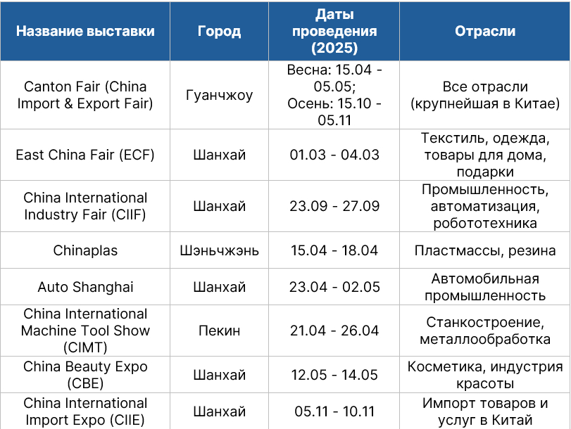Ниже в таблице представлен календарь ключевых B2B-выставок в Китае на 2025 год по отраслям.