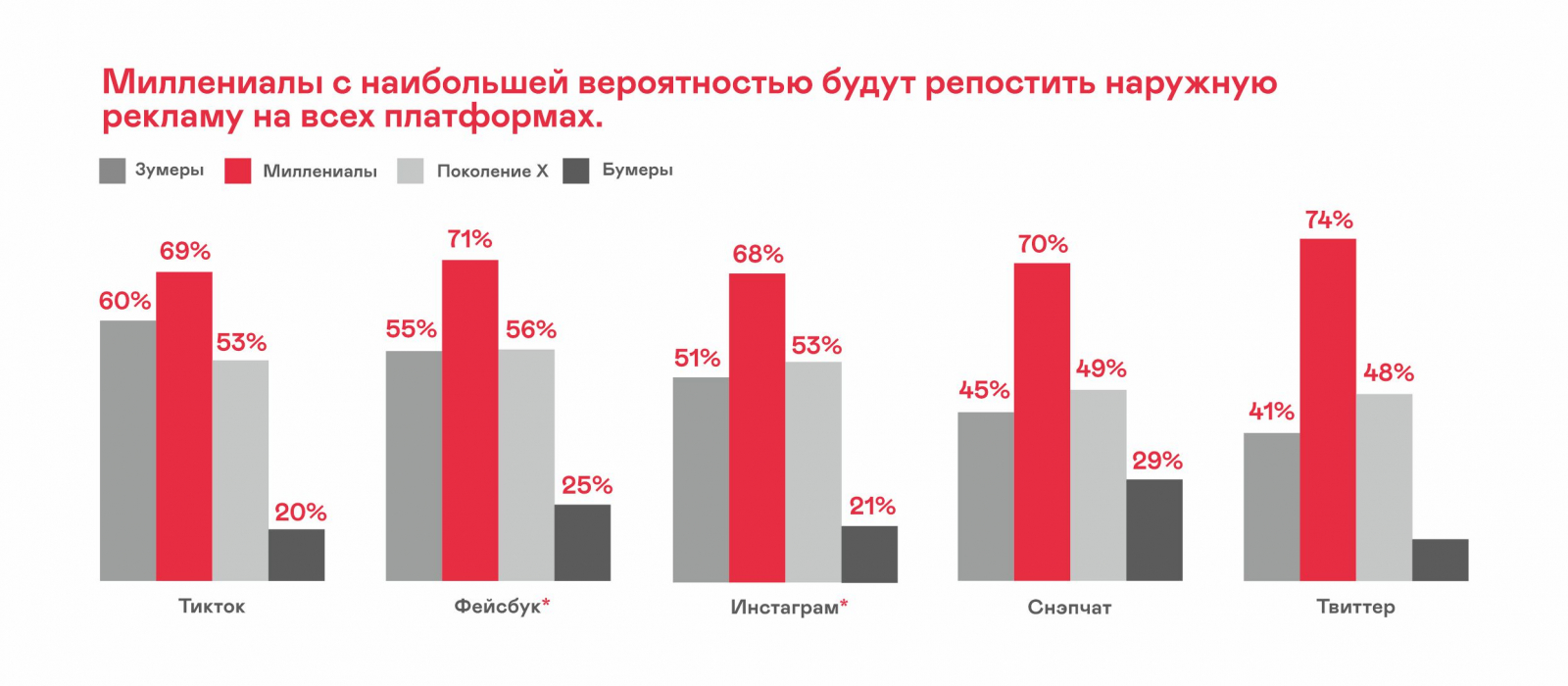 4. Топ-5 платформ, пользователи которых реагируют на наружную рекламу: Tiktok (82%), Instagram* (81%), Facebook* (80%), Snapchat (78%), X (76%).