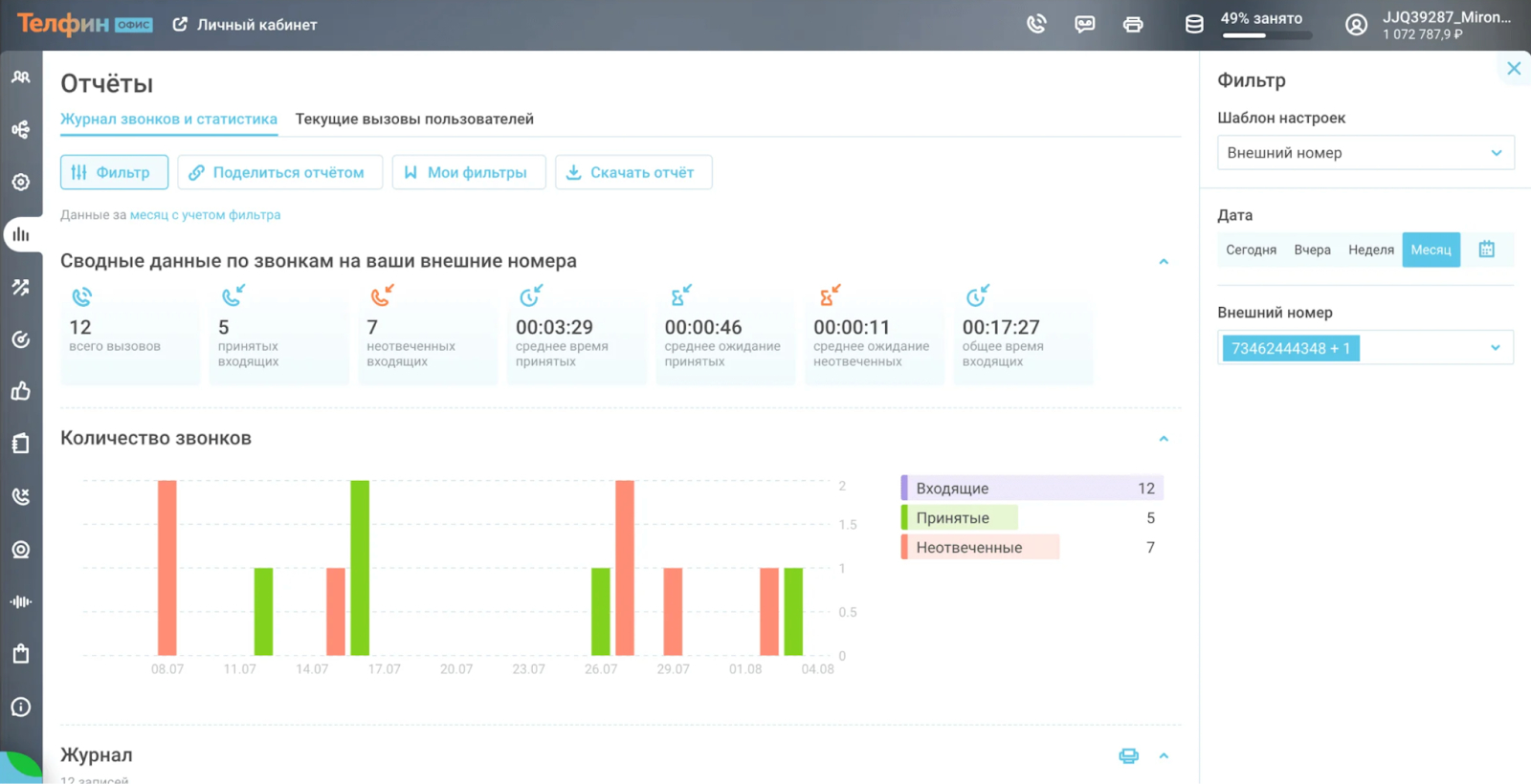 - Статистика по входящим, исходящим и неотвеченным звонкам.