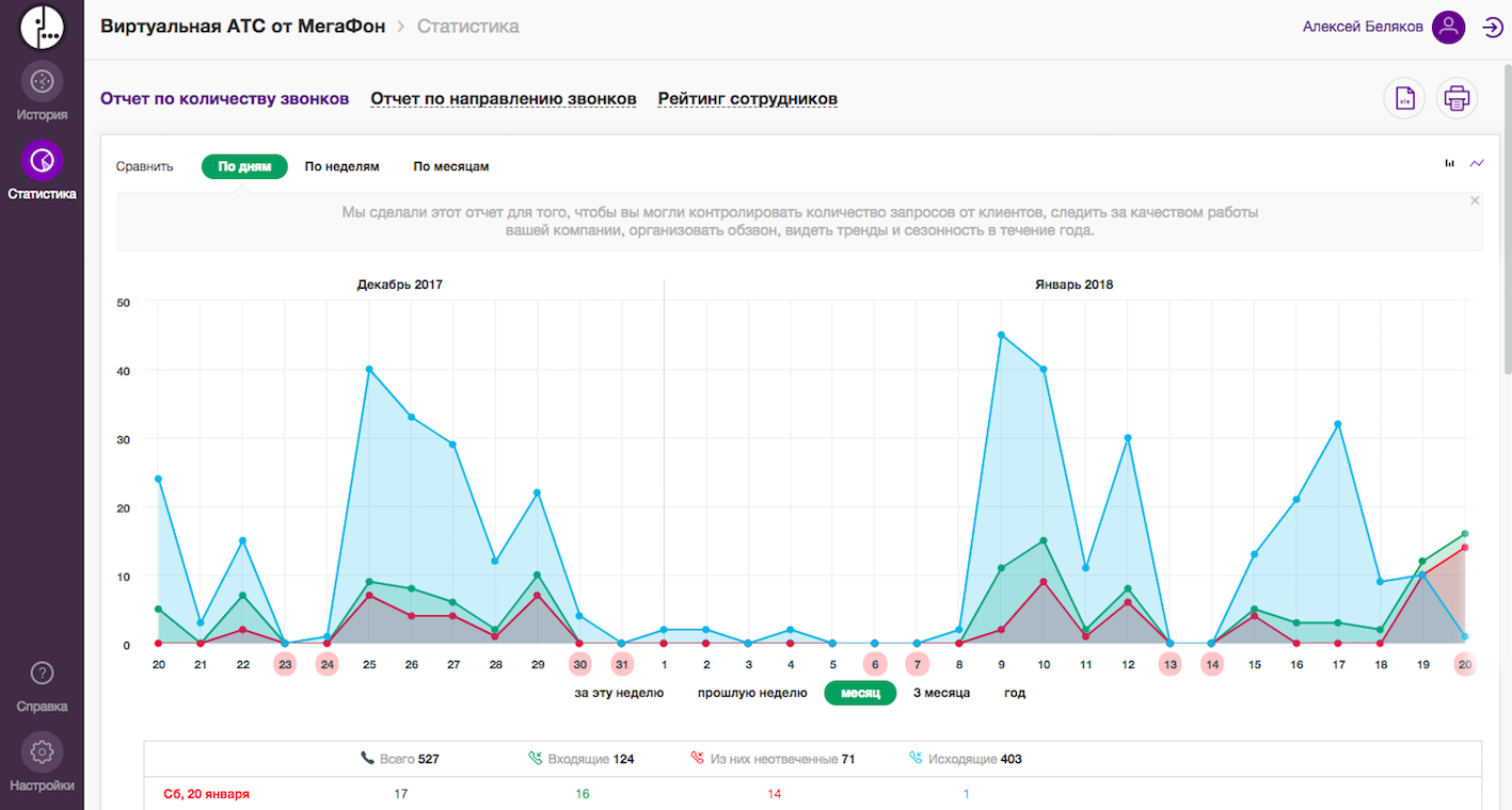 - статистику по входящим, исходящим и пропущенным вызовам;