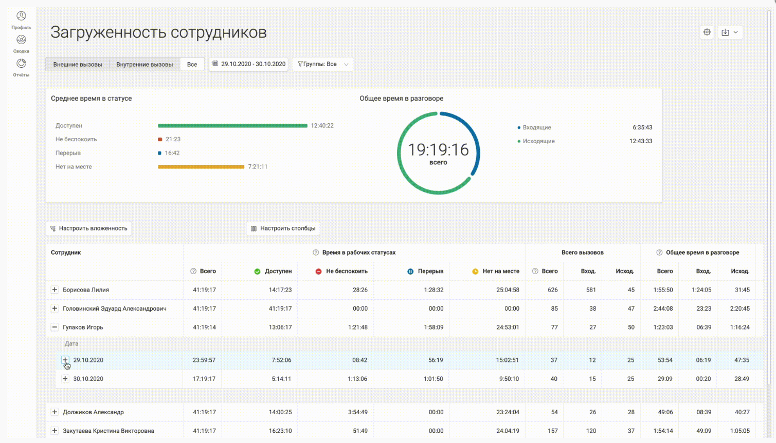- мониторинг среднего времени ответа и доли пропущенных вызовов по каждому оператору.