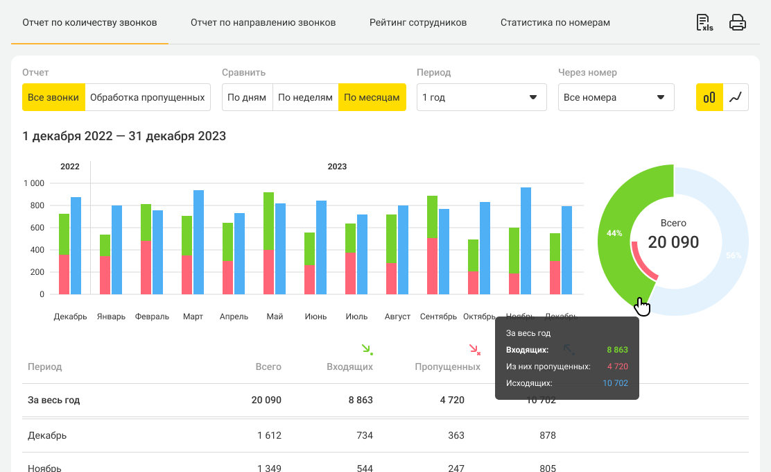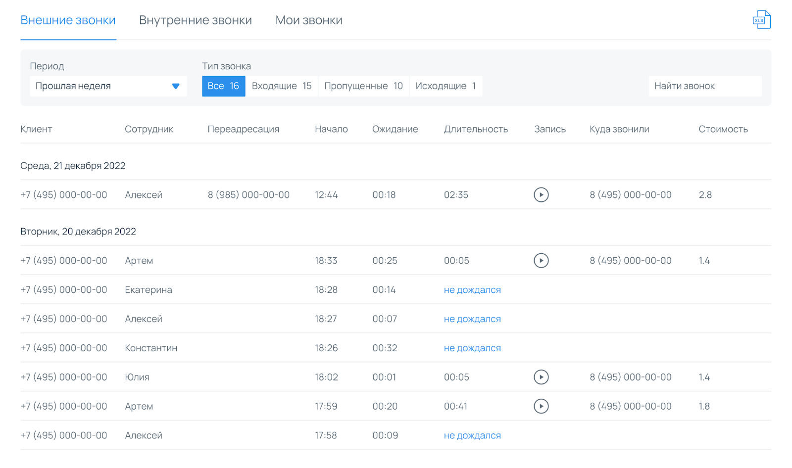 - выгрузка отчётности по звонкам в XLS-формате;