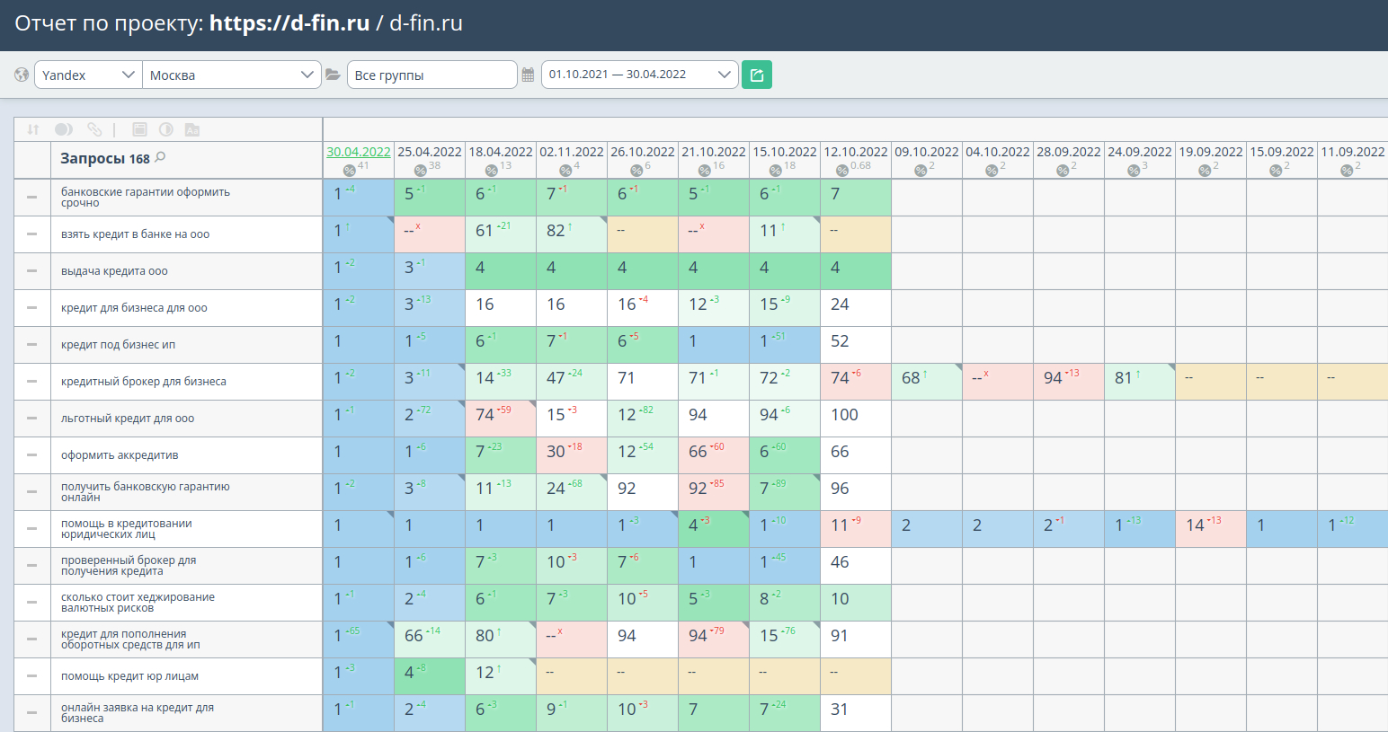 Разработали дополнительные посадочные страницы под определенные кластеры семантического ядра. В результате, те запросы, которые ранее не были даже в ТОП-100 находились выше ТОП-30, а некоторые из них попали в ТОП-10 по Москве.