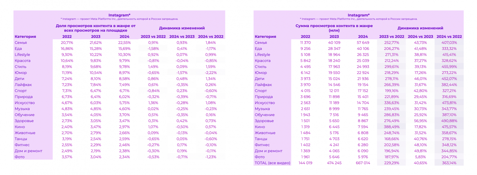 По данным за три года (2022–2024), главные жанры в Reels остаются неизменными: Семья, Еда, Lifestyle, Красота и Стиль. Их доля в сумме просмотров почти не изменилась, что говорит о стабильности предпочтений пользователей. За этот период совокупные просмотры Reels выросли почти в 4 раза (на 363%). Причём основной рост пришёлся на 2023 год. Рост произошел за счет того, что авторы стали публиковать больше Reels. Формат оказался востребованным у аудитории, что подтверждается ростом числа просмотров на один Reels.