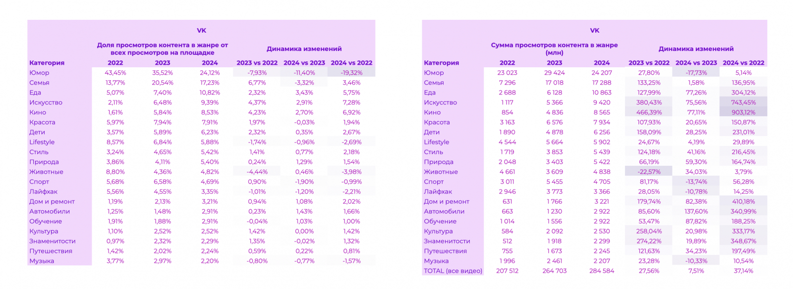 Замедление YouTube в 2024 году привело к заметному сокращению охватов и просмотров в Shorts и, в меньшей степени, в традиционных горизонтальных видео. Это не только подорвало рост, но и отразилось на объёмах самого контента, который авторы выпускают на платформе. В то же время, в мире коротких роликов (Reels, Clips, Shorts) за последние три года стали очевидны отличия в развитии жанров: если Instagram сохраняет стабильную структуру, а в YouTube изменения плавны, то ВКонтакте претерпевает значительные сдвиги в сторону более разнообразного контента.