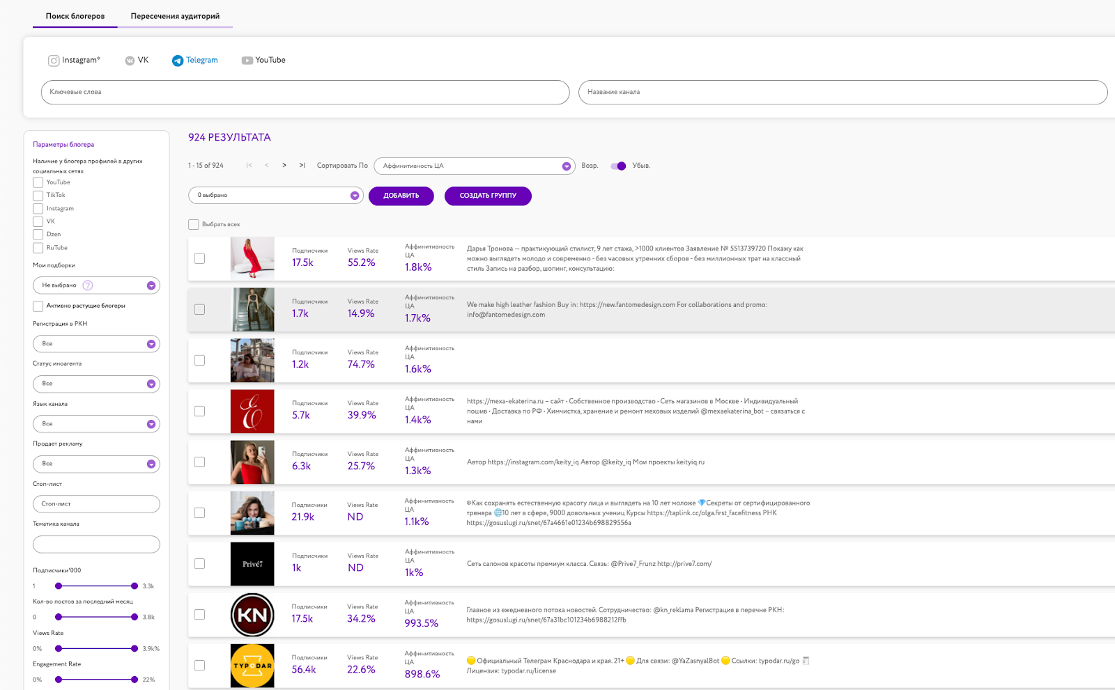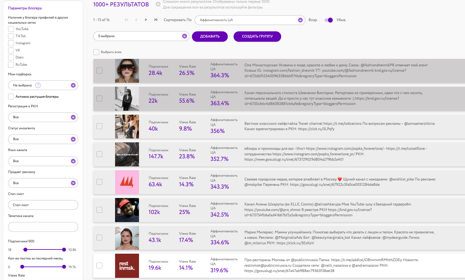 - При подборе агентство комбинирует фильтры: аффинитивность, число подписчиков, просмотры, вовлечённость, частота публикаций и т.д.