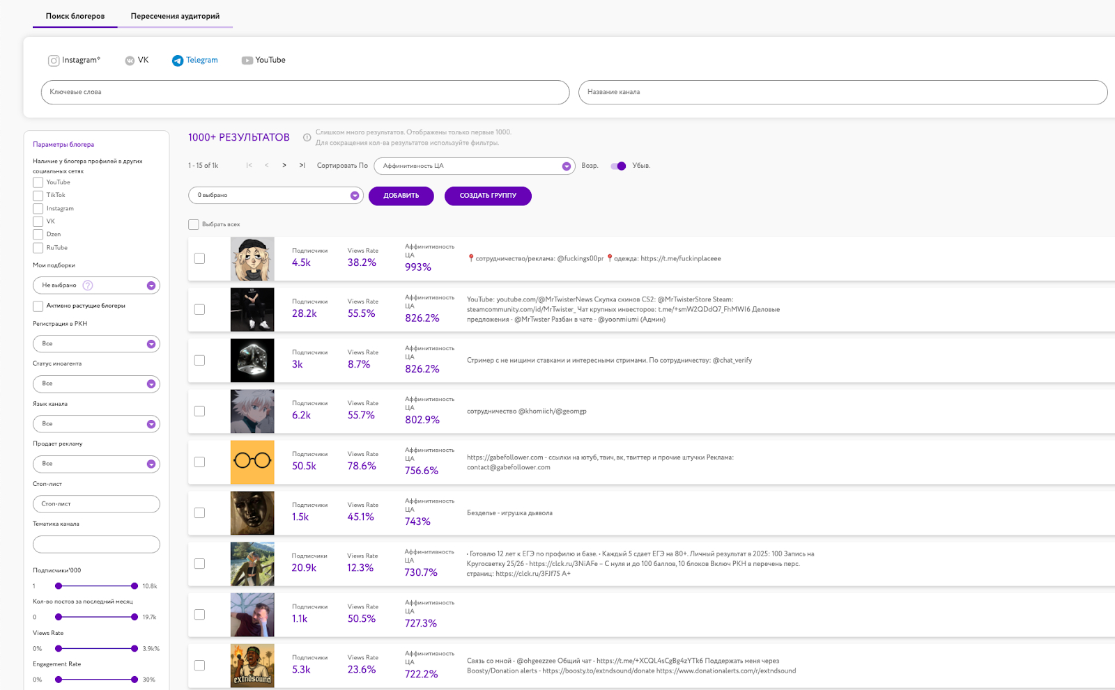 Результат: точность формирования выборок блогеров повысилась. И нередко индекс аффинитивности превышает 1000 %, а в отдельных случаях достигает 5000–6000 %.