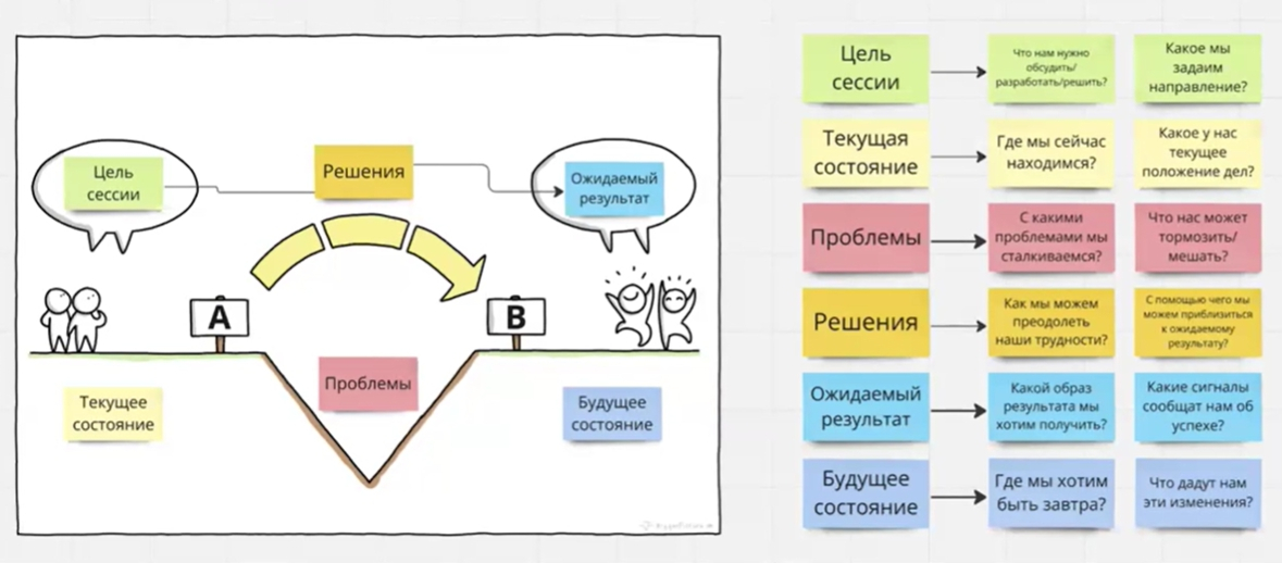 Но на практике всегда возникают нюансы, которые мешают собрать картинку будущего, понять план и принципы действий. Они могут касаться сложной групповой динамики, количества участников, времени проведения сессии, невозможности применять те или иные инструменты.