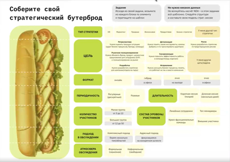 «Стратегический бутерброд» требует довольно большого количества «ингредиентов», но зато позволяет правильно забрифоваться на работу. Сами ингредиенты мы уже рассмотрели в предыдущем разделе статьи — это те самые группы параметров для классификации стратсессий.