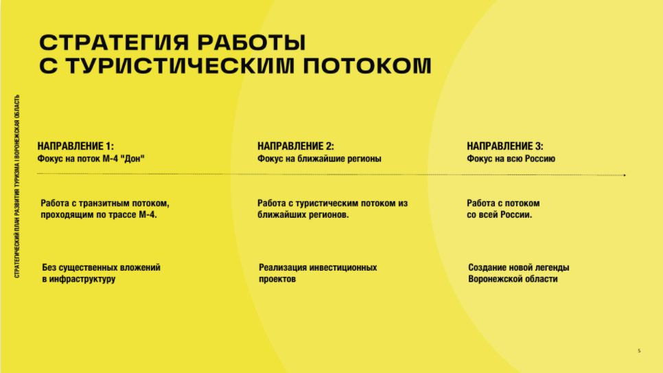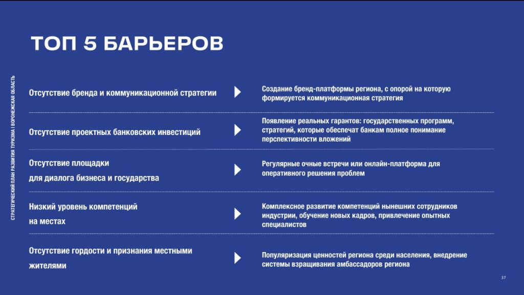 При формировании «Стратегического плана» провели встречу с представителями туристической отрасли. На основе портретов транзитных путешественников проанализировали точки интересов Воронежской области на соответствие запросов разных групп. Например, выявили задачи по предотвращению барьеров и усилению мотивов: чтобы паре с детьми сойти с маршрута и посетить семейный центр или паре без детей сделать остановку на 6 часов в глубине области. Использовали подход, основанный на постепенном увеличении нагрузки на регион и получении первых результатов на имеющейся инфраструктуре при небольших изменениях.