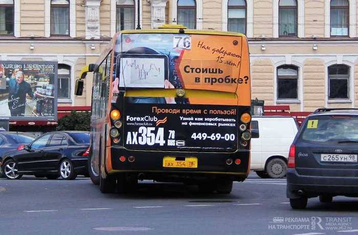 Группа компаний FOREX CLUB оценивает эффективность рекламной кампании на транспорте в Петербурге. Проект реализован лидером отрасли транзитной рекламы в Санкт-Петербурге «062-Реклама». Контрастные изображения на всех трех бортах автобусов, благодаря использованию в макете атрибутики современной деловой жизни, выполняют задачу имиджевой рекламы. В то время, как крупный контактный блок призывает людей к действию: набрать номер, пока стоишь в пробке.