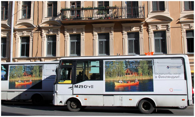 Совет по туризму Финляндии проводит в Санкт-Петербурге кампанию в поддержку Финляндии как туристической дестинации. Одним из основных средств коммуникации является наземный общественный транспорт.