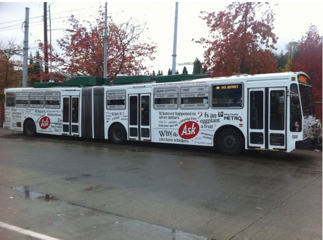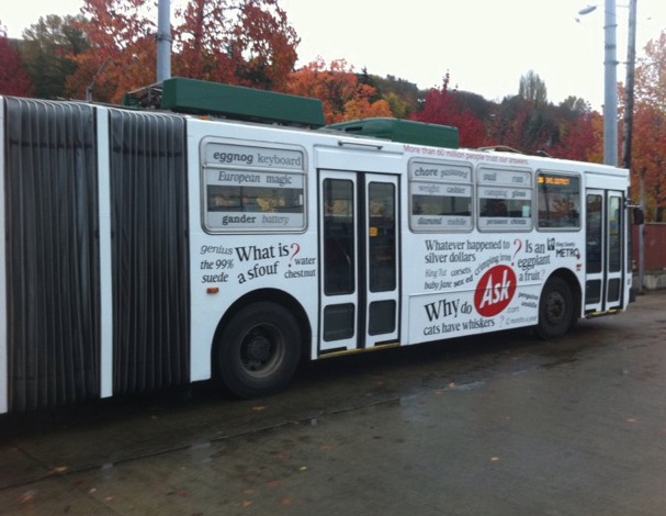 Популярный в США поисковик Ask.com в рамках кампании «Ответим на 60 миллионов вопросов» демонстрирует свои возможности с помощью транзитной рекламы, расписав борта автобусов примерами вопросов, как дурацких, так и серьезных. Формат размещения: художественно оформление четырех бортов.