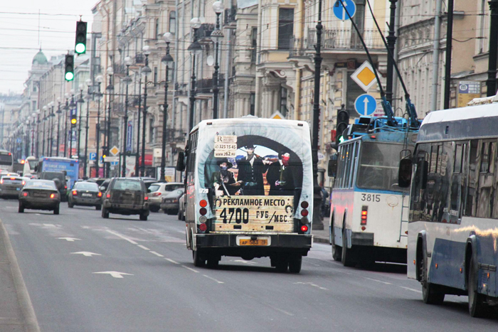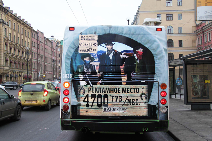 В марте этого года крупнейший федеральный оператор транзитной рекламы, «062-Реклама», превратил автобусы на улицах Петербурга в большие крытые повозки в стиле «вестерн», мчащиеся по скалистым прериям Дикого Запада. Из повозки на автомобилистов и прохожих взирают ковбои, предлагая последовать их примеру, и тоже прокатить свою рекламу на заднем борте автобуса.