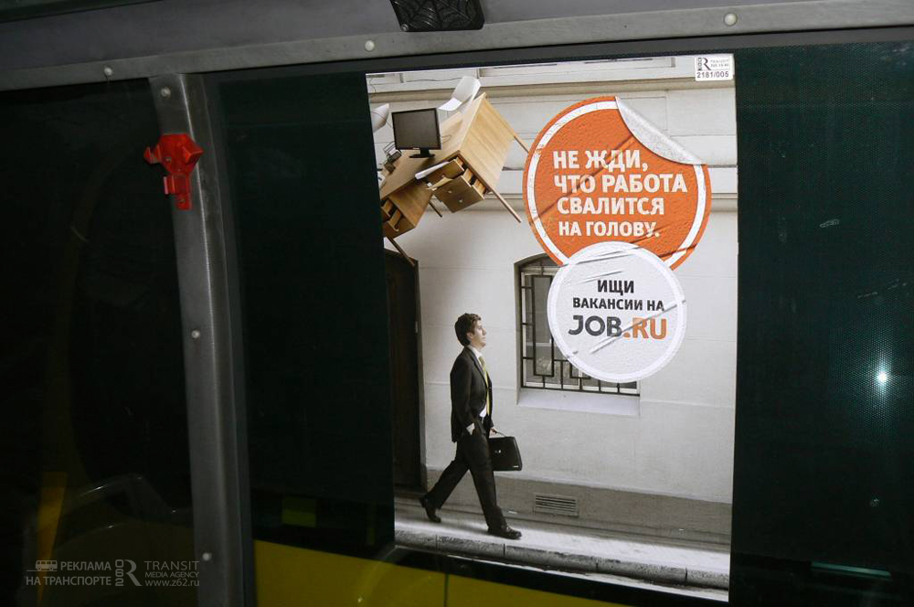 JOB.RU. – Сотни тысяч соискателей ежедневно, более того, ежеминутно, видят нашу рекламу, которая не только в течение длительного времени находятся с ними «лицом к лицу», но и привлекает внимание юмором. JOB.RU помогает соискателям и работодателям найти друг друга, а реклама на транспорте помогает людям найти нас».