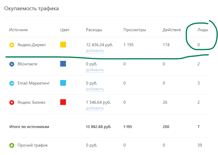 Мы исправили настройки интеграции, и, спустя неделю, получили полную и достоверную информацию о затратах, лидах, сделках и эффективности рекламы.