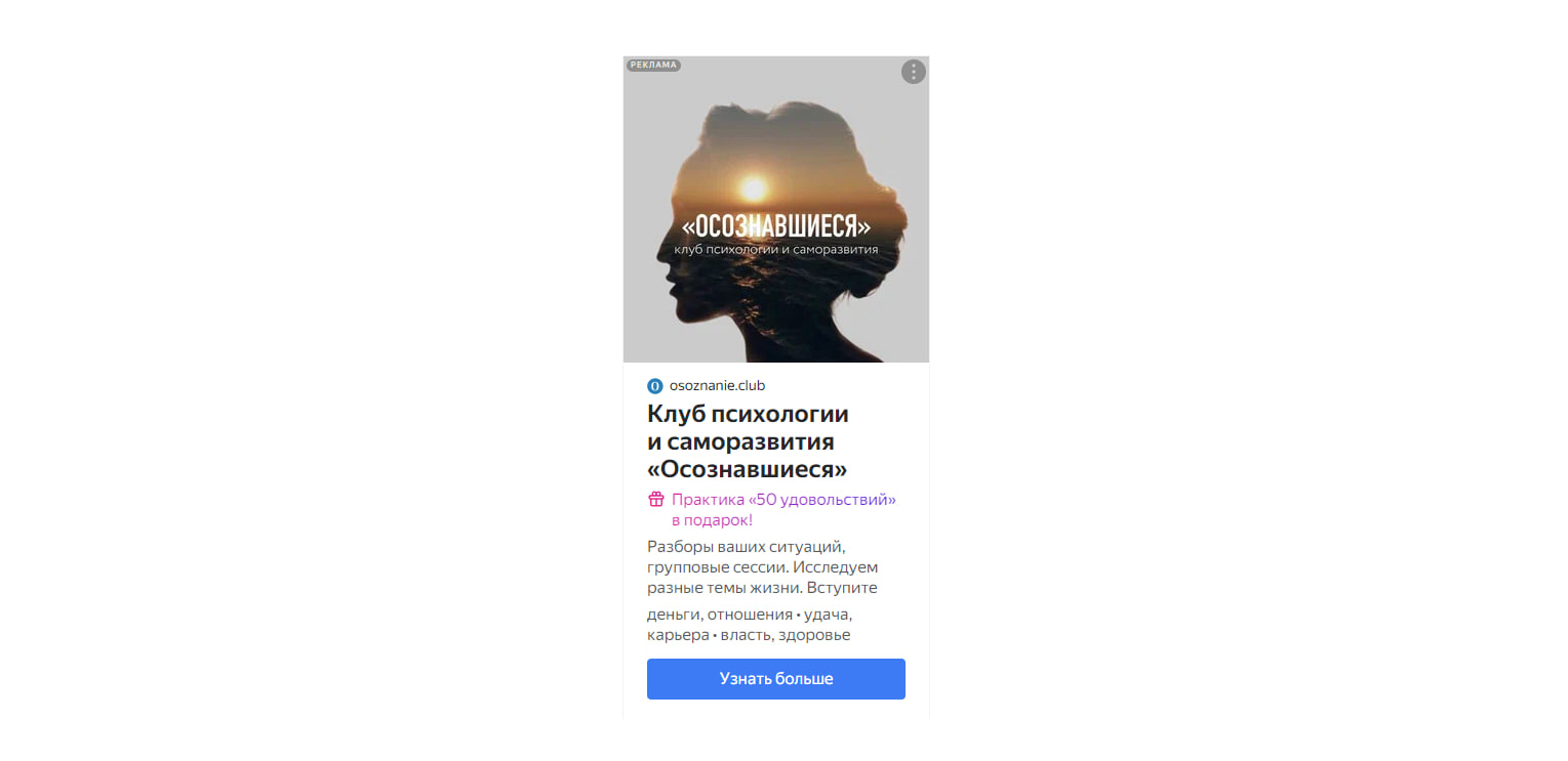 Мы использовали удобную функцию Яндекса, позволяющую создавать объявления на основе постов из Телеги. Пользователи переходили по объявлениям на мини-лендинг, и чтобы прочитать пост, нужно было подписаться на канал. Подписчиков собирали со всей России.