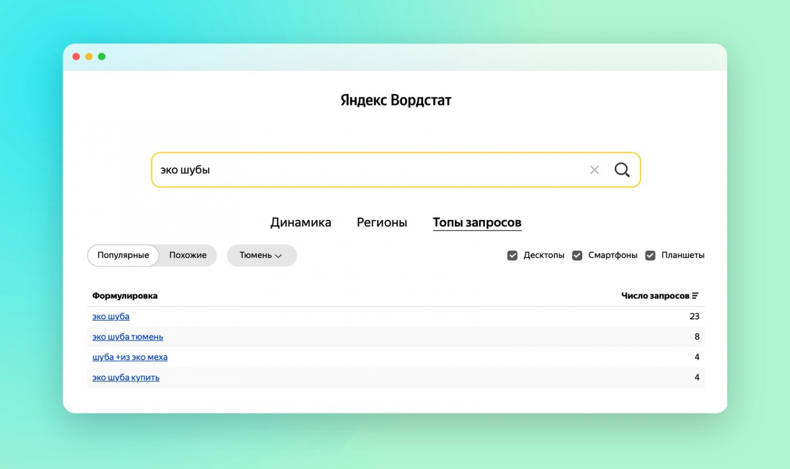 Мы провели тщательный анализ и сбор всех возможных поисковых запросов, связанных с экошубами. Для расширения списка использовались специализированные сервисы. Это позволило нам понять, какие ключевые слова и фразы чаще всего используют потенциальные клиенты при поиске товаров.