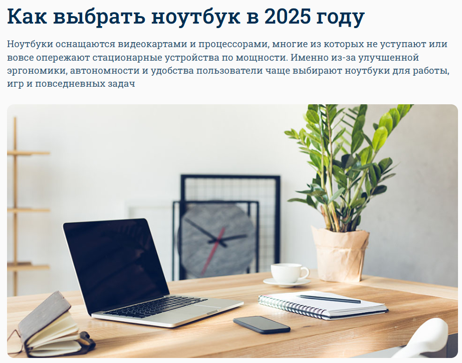 - Кейс: статья 2009 года «Как выбрать ноутбук». Обновите характеристики (SSD вместо HDD), добавьте раздел про AI-чипы, удалите упоминания Windows Vista.