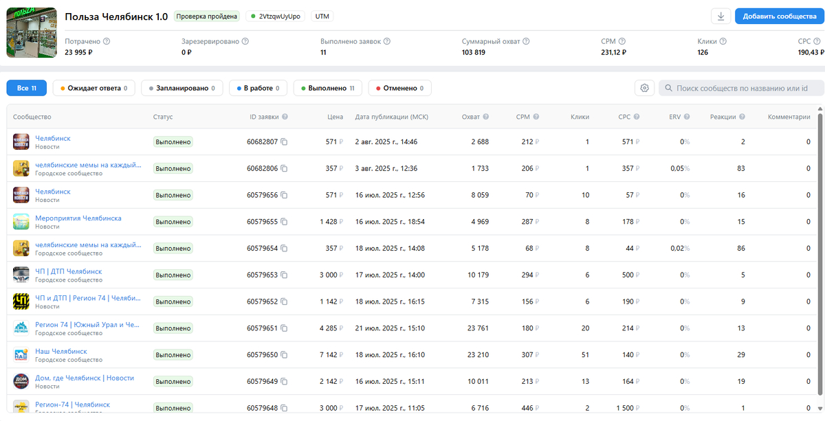 Особенность платформы: поиск по географии не всегда точен. Например, если выбрать «Челябинск», система иногда показывает паблики, где жителей Челябинска всего 10%. Поэтому мы ориентировались на название паблика и тематику, чтобы попасть в целевую аудиторию.