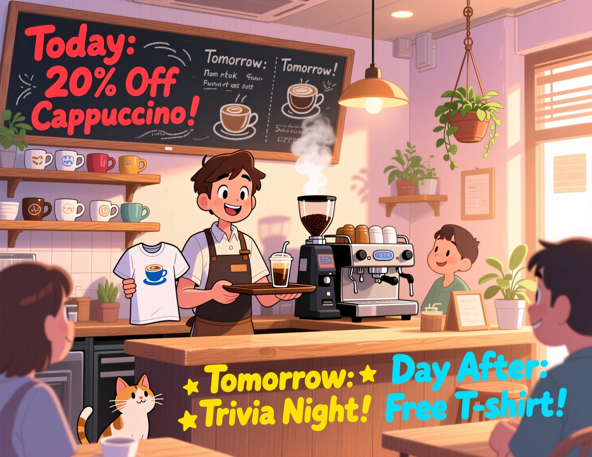 Сегодня — скидка на капучино, завтра — розыгрыш мерча, послезавтра — викторина в Stories. Аудитория теряется: «Вы кофейня или лотерея?». Результат — размытый бренд и хаотичные продажи.