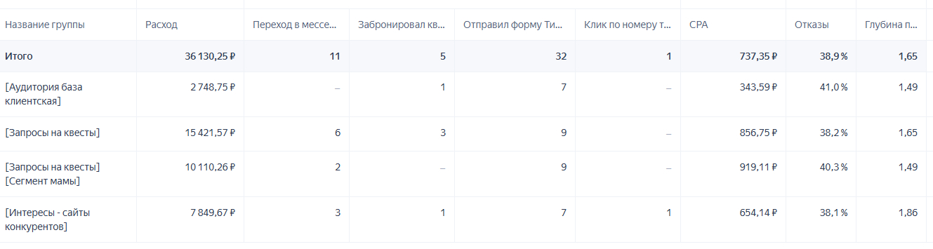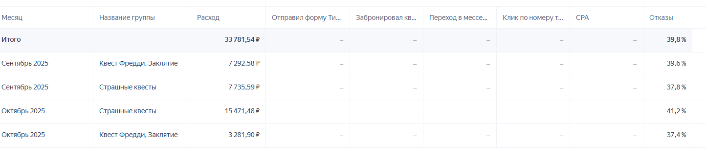 Сегментация отсутствовала. Все ключевые фразы были свалены в одну группу. Не было разделения по типам аудитории, намерениям, теплоте запроса. Объявления показывались всем одинаково — и тем, кто ищет «квест на день рождения», и тем, кто ищет «страшный квест для двоих».