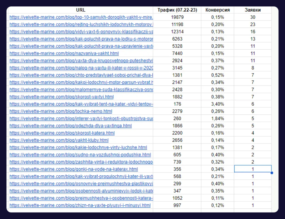 Для производителя катеров мы собрали семантическое ядро, написали и опубликовали статьи. И вот какой трафик и заявки получили со статей.