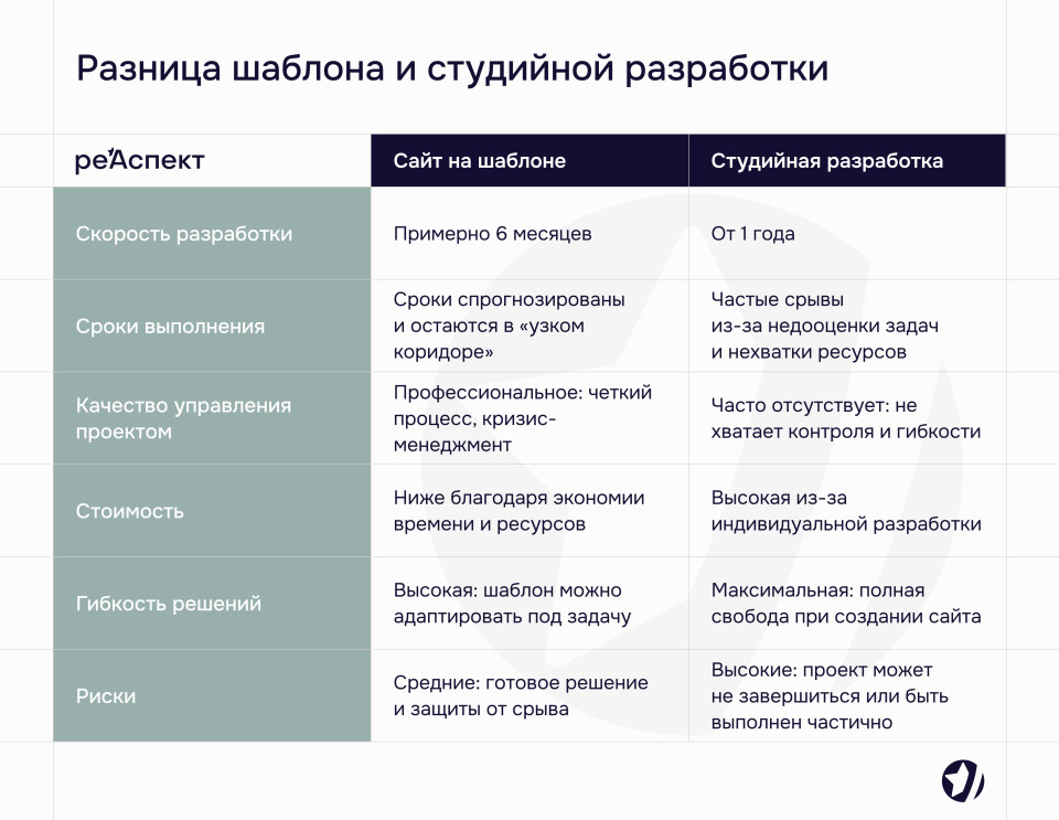 При создании сайта бизнесу обычно предлагают три основных подхода: использование конструктора, студийную разработку или сайт на шаблоне. Каждый из них имеет свои особенности, которые важно учитывать при выборе. Чтобы упростить понимание и помочь вам разобраться, мы подготовили сравнительные таблицы. Они наглядно покажут, чем отличаются эти решения и в каких случаях они подходят.