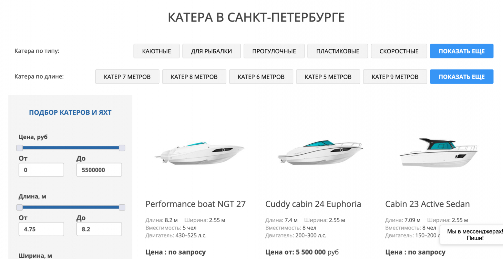 Для производителя катеров Velvette Marine мы создали региональные страницы, прописали им h1, title, description, сгенерировали тексты и поставили на них ссылки с основного каталога.