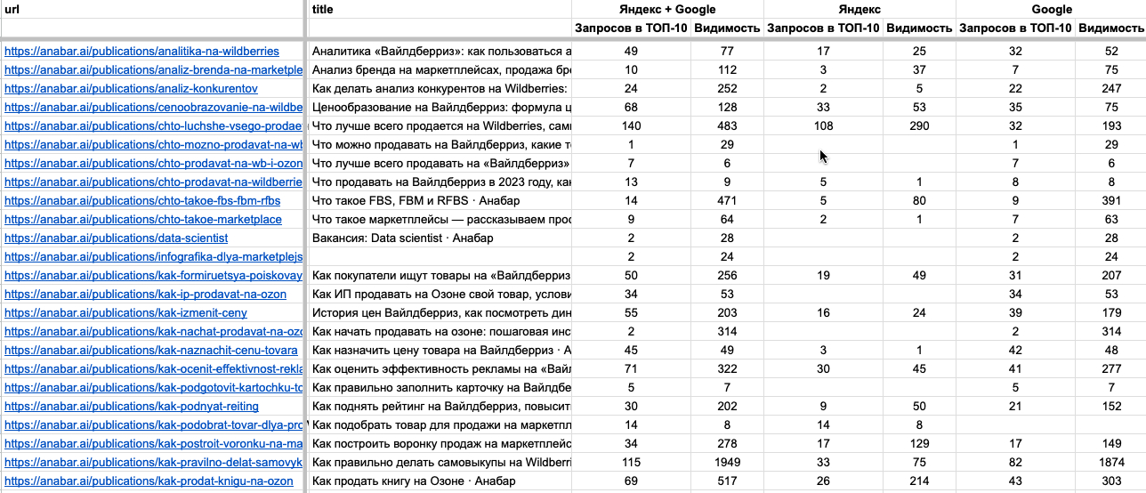 Чтобы выбрать темы статей, можно использовать собранные запросы либо проанализировать статьи конкурентов с поисковой видимостью и выбрать их них.