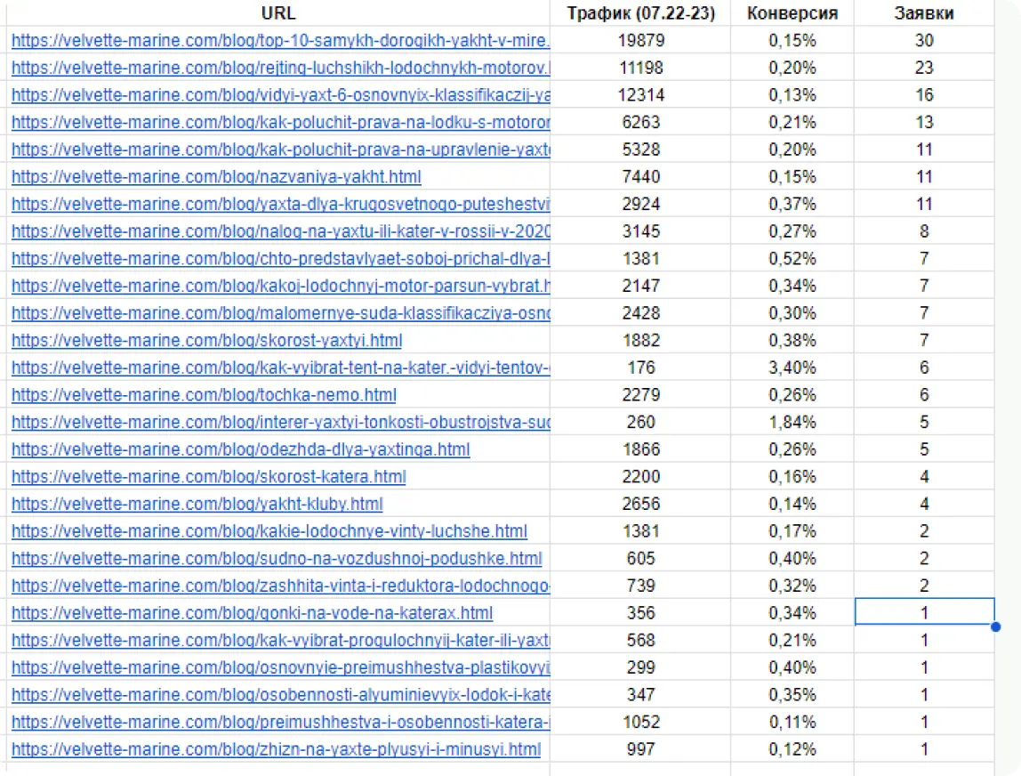 Так, для Velvette Marine мы собрали семантическое ядро, сделали ТЗ для текстов, написали и опубликовали статьи и добавили в них конверсионные элементы.