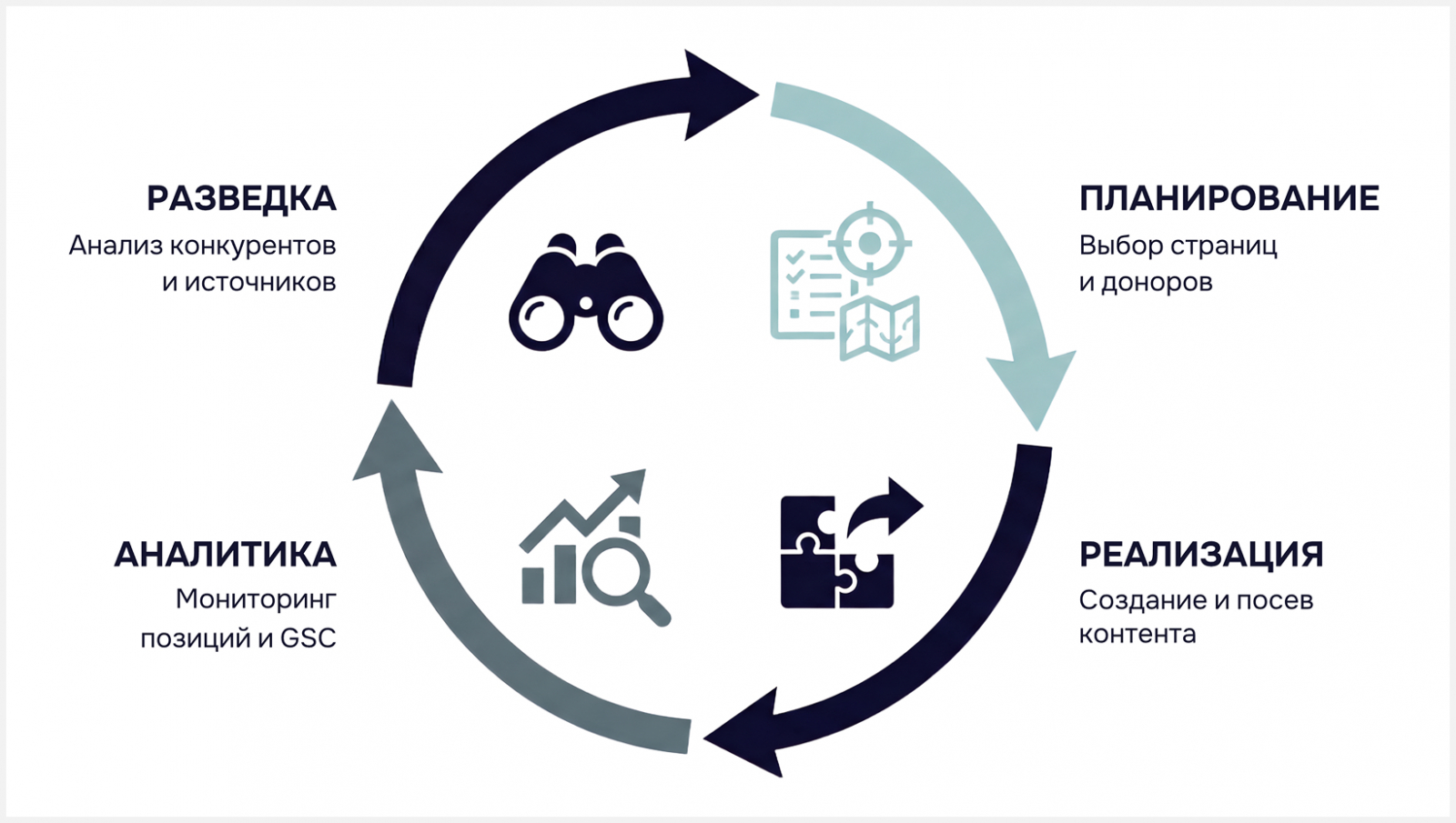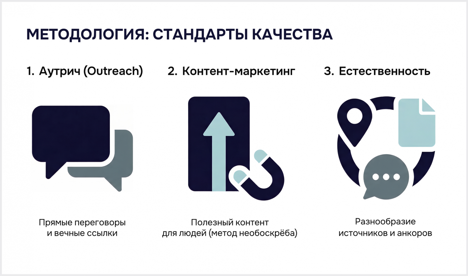 Безопасный линкбилдинг строится на принципах естественности и пользы. Мы выделяем три ключевых направления работы, которые формируют «белый» профиль.