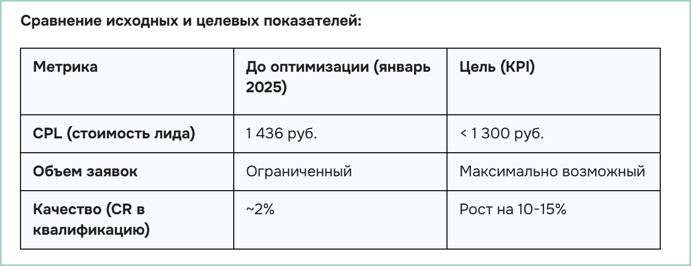 В начале 2025 года клиника, специализирующаяся на лечении катаракты и лазерной коррекции, зафиксировала падение показателей в VK Рекламе. Стоимость лида (CPL) составляла 1 436,78 рубля при конверсии в квалифицированную запись около 2%. Ситуация требовала декомпозиции процессов для достижения целевого показателя CPL ниже 1 300 рублей.