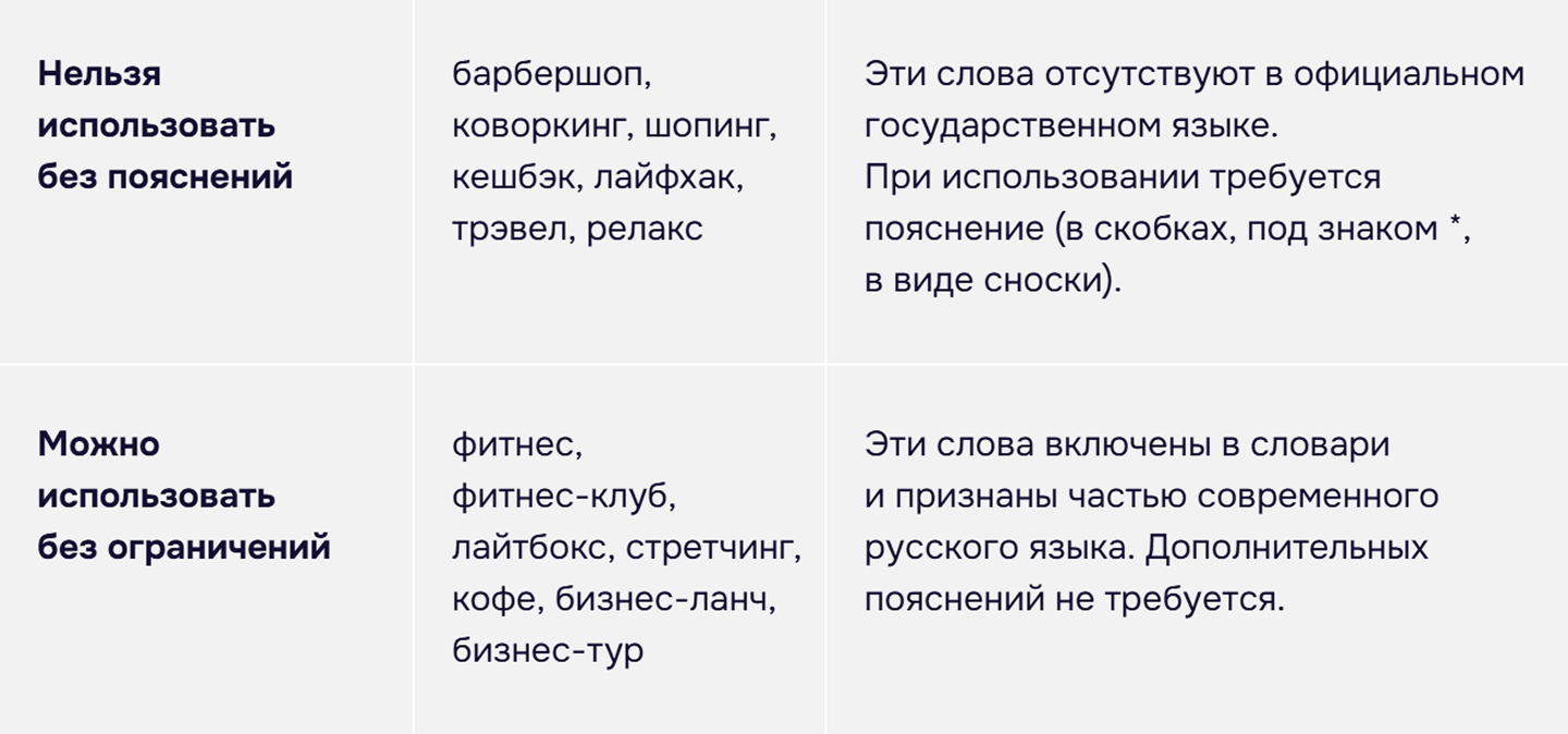 В информации, предназначенной для клиента, бизнес обязан использовать государственный русский язык (п. 2 ст. 1 Федерального закона от 24.06.2025 № 168-ФЗ). Это касается и слов-англицизмов — заимствований, которые созвучны с английскими словами, но написаны кириллицей (например: кешбэк, шопинг, лайфхак).Не все англицизмы можно отнести к государственному русскому языку. Граница определяется по «Словарю иностранных слов» (разработчик — ФГБУ науки Институт лингвистических исследований РАН), утвержденному Распоряжением Правительства РФ от 30.04.2025 № 1102-р.