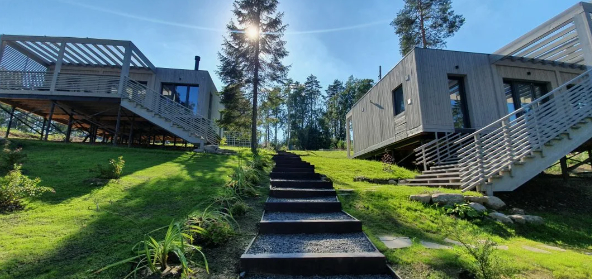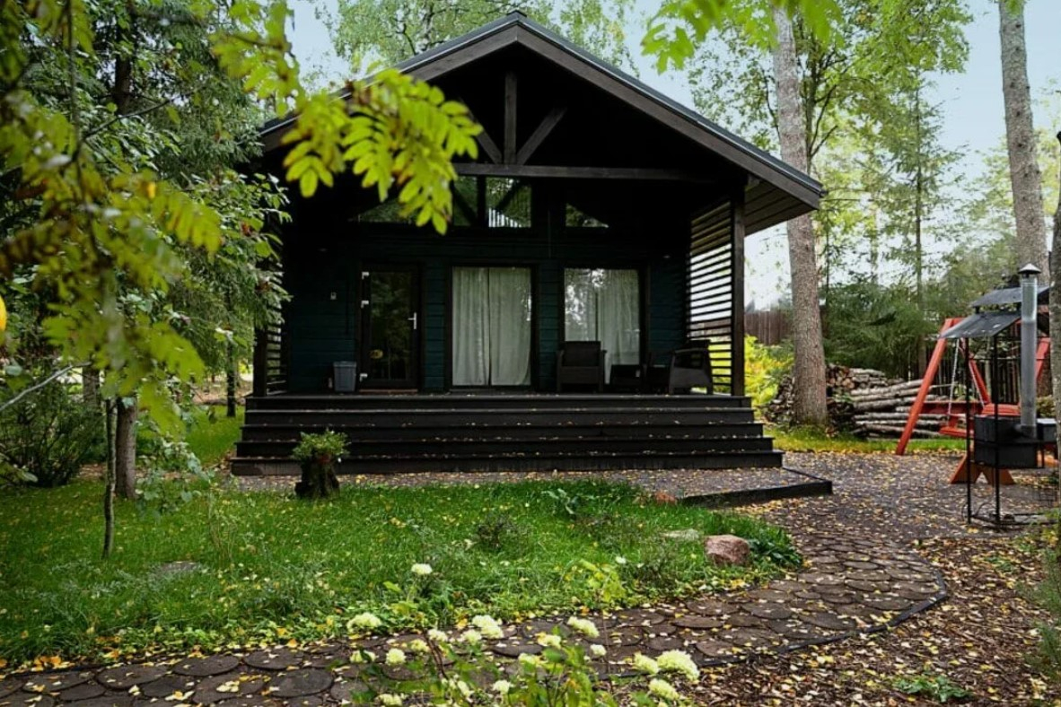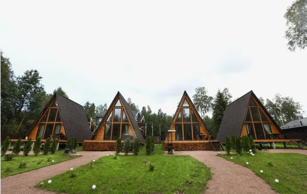 Комплекс включает два дома в стиле лесных шале с дизайнерским ремонтом из натуральных материалов: дерева, камня, льна, шерсти и хлопка.