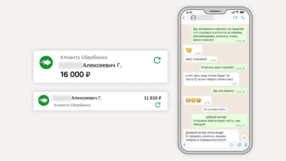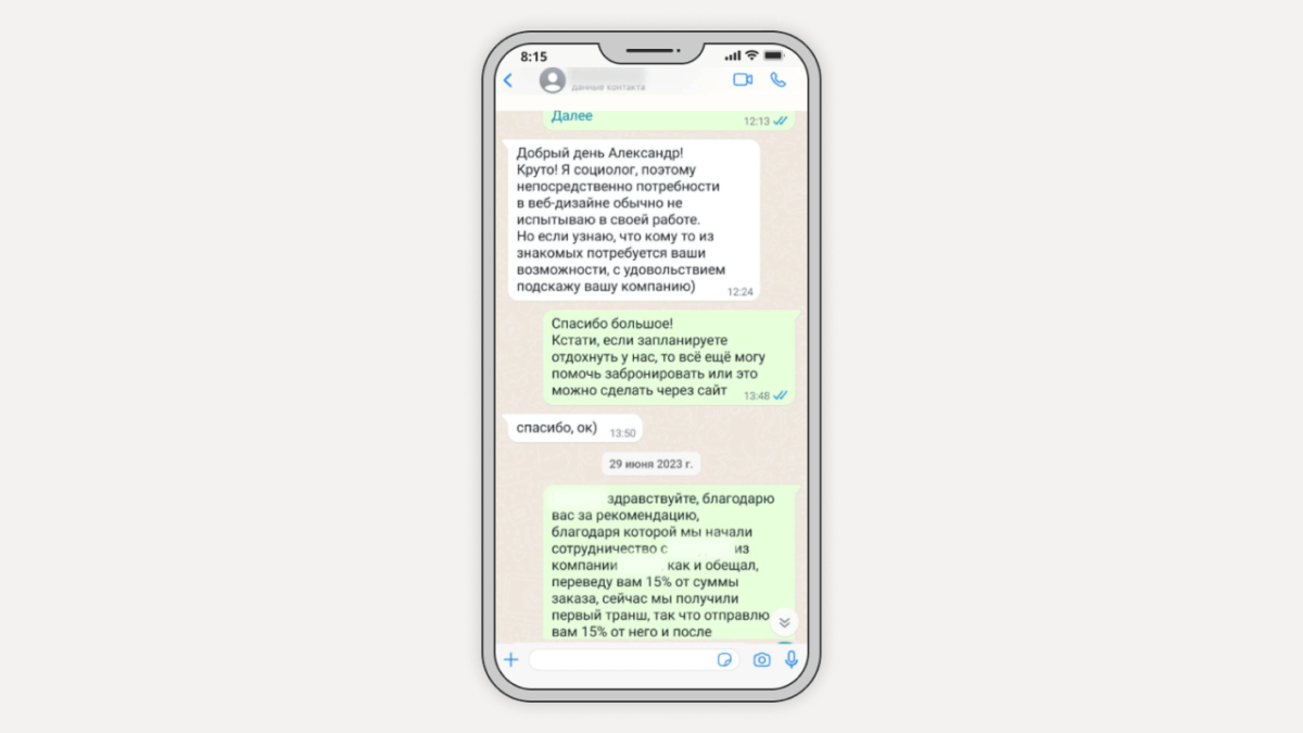 Заключив договор, и получив половину от суммы, мы сразу же отправили партнеру обещанные 15 процентов. Только посмотрите, он просто в шоке от суммы, которую ему перечислили.