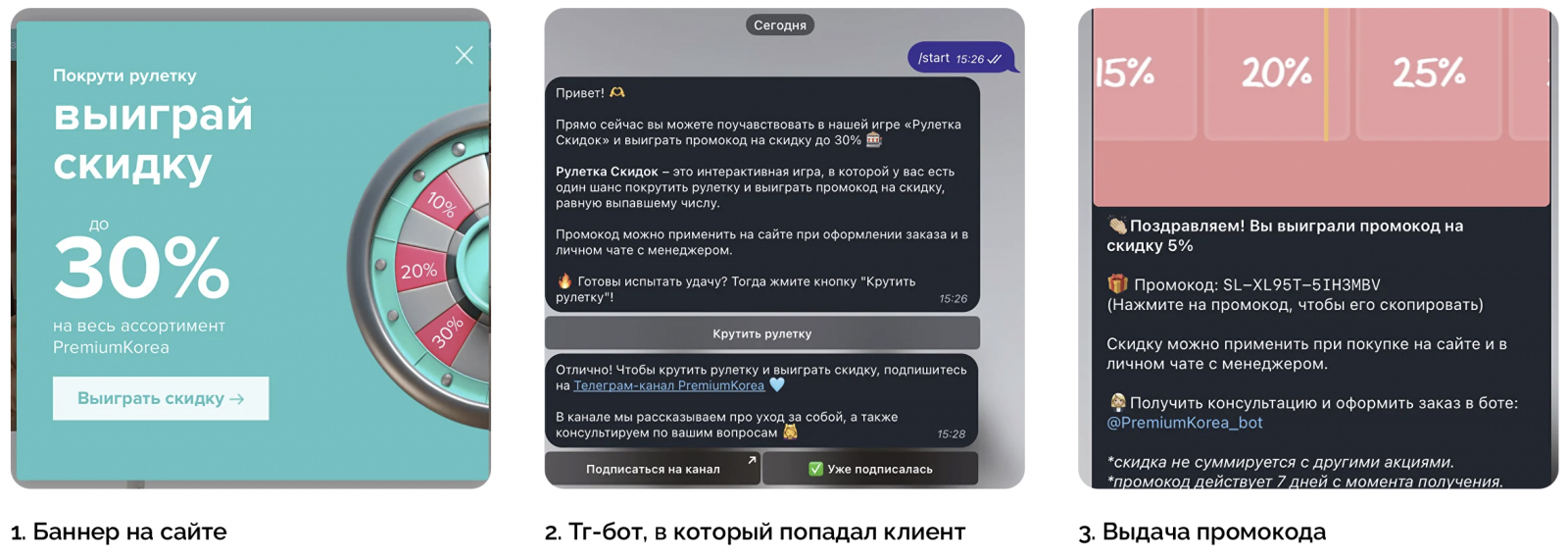 3) Бот автоматически проводил весь путь клиента: от знакомства с механикой игры «Рулетка Скидок», подписки на тг-канал и выдачи промокода на скидку.