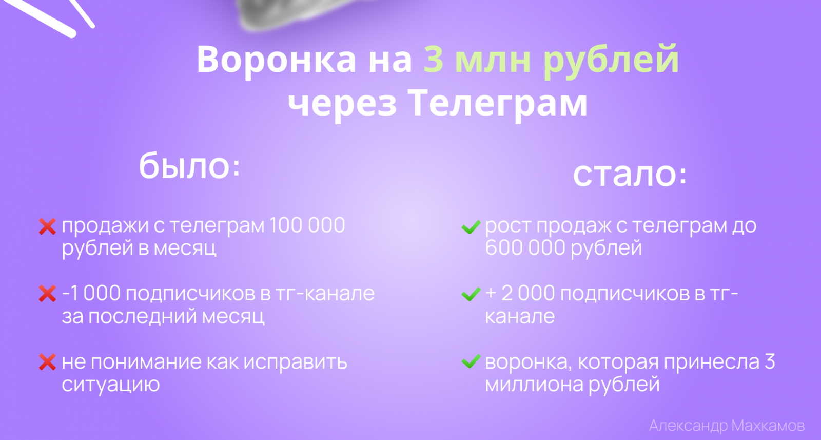 Сейчас, продажи с Телеграм выросли в 6 раз до 600 000-700 000 рублей в месяц (даже после отключения воронки).