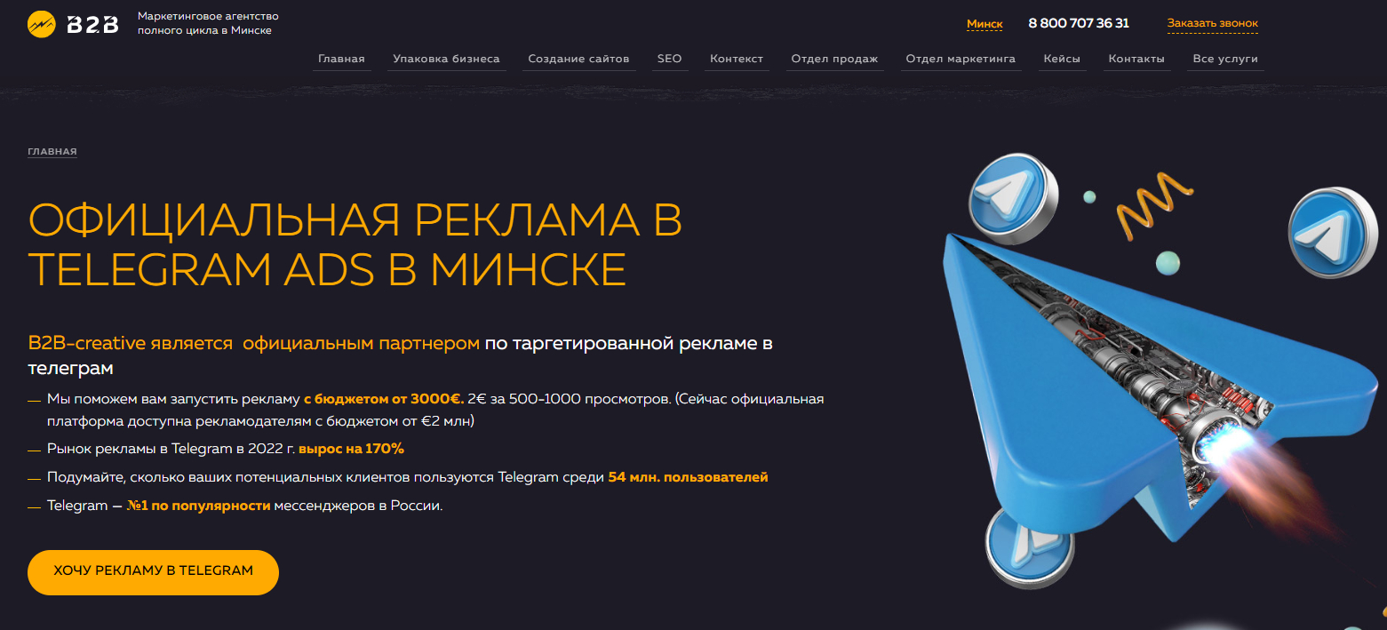 Также, как и во многих агентствах, рекламный бюджет не входит в стоимость и минимальная сумма пополнения РК Telegram Ads 1500 евро + НДС.