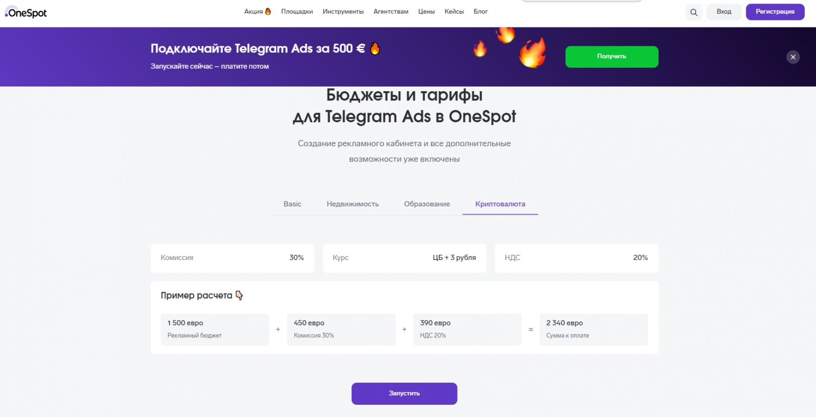 Агентство Telegram Ads имеет достаточно хороший сайт, где можно найти почти всю интересующую информацию. Насколько я поняла, они работают с посредником и предоставляют сами лишь услуги ведения рекламы, потому что ценник на регистрацию РК очень похож на OneSpot.