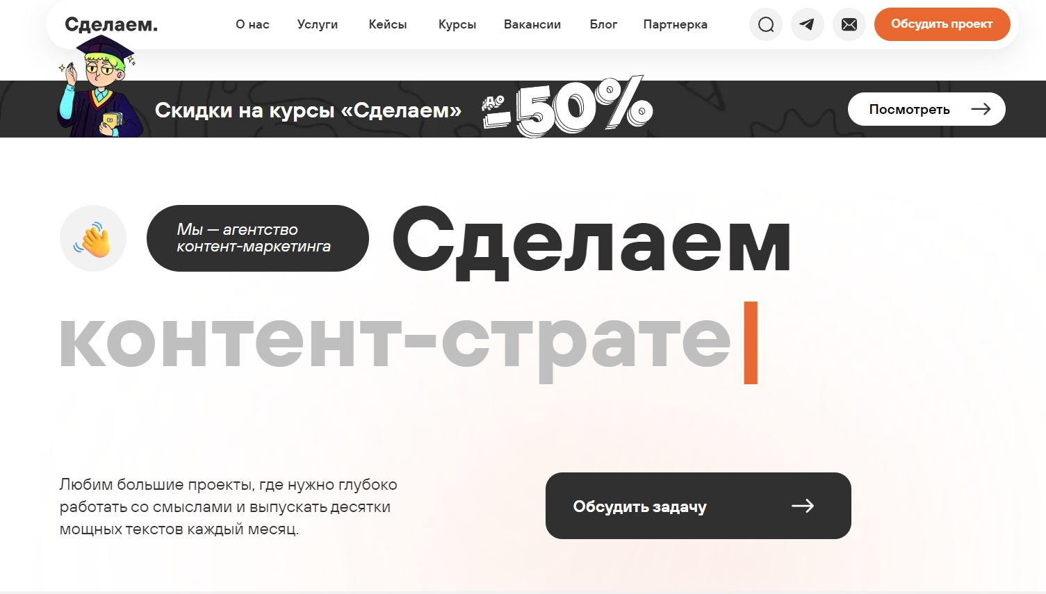 Агентство “Сделаем” предоставляет комплексные услуги в области контент-маркетинга: пишут статьи, ведут соцсети, делают лендинги, продюсируют образовательные курсы. Компания активно делится своим опытом в области контент-маркетинга через корпоративный блог и ведет образовательные курсы по копирайтингу, среди которых есть и бесплатные.