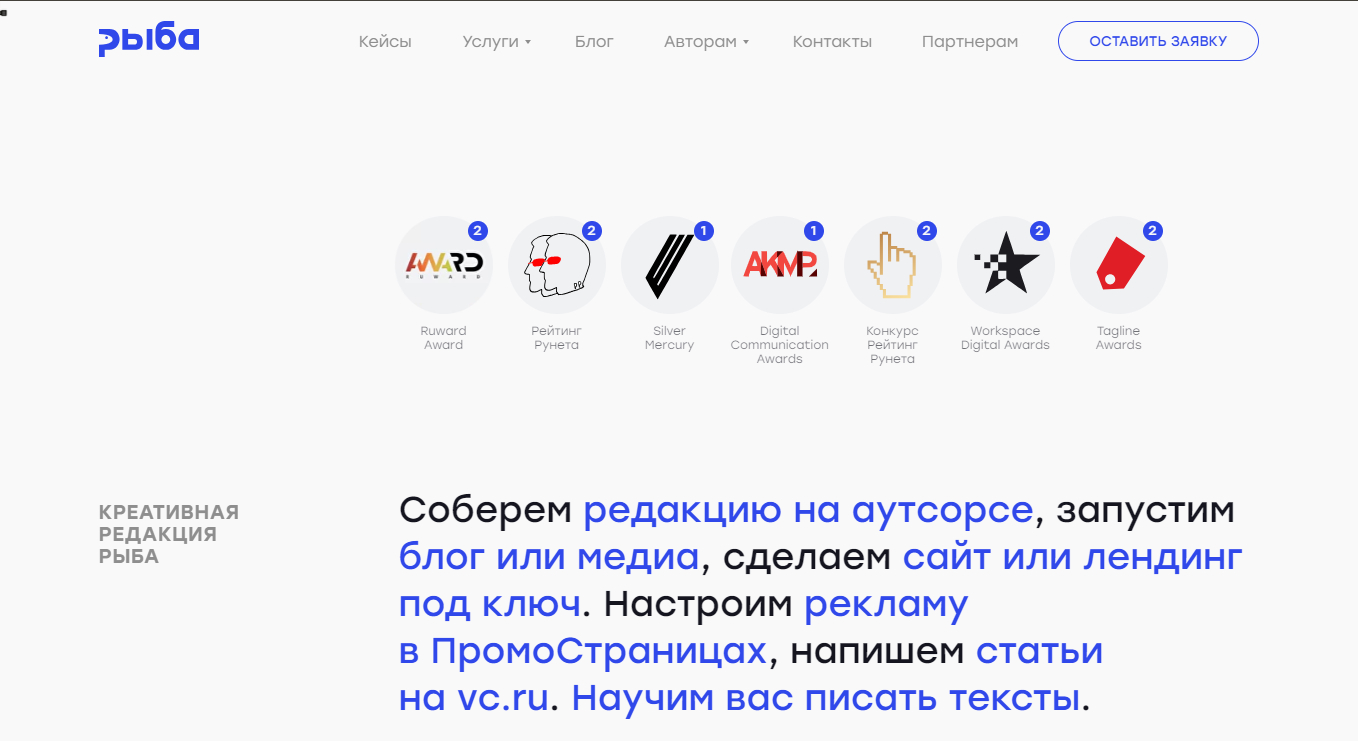 Команда Texterra работает с разными задачами контент-маркетинга, от написания небольших текстов до создания полноценных электронных книг и сценариев. Также Texterra занимается аудитом текущей стратегии продвижения и помогает оптимизировать работу контентной команды. Сайт агентства производит впечатление удобного и продуманного ресурса. Навигация понятная, информация об услугах представлена детально. В блоге на сайте делятся гайдами, подборками и исследованиями в сфере маркетинга.