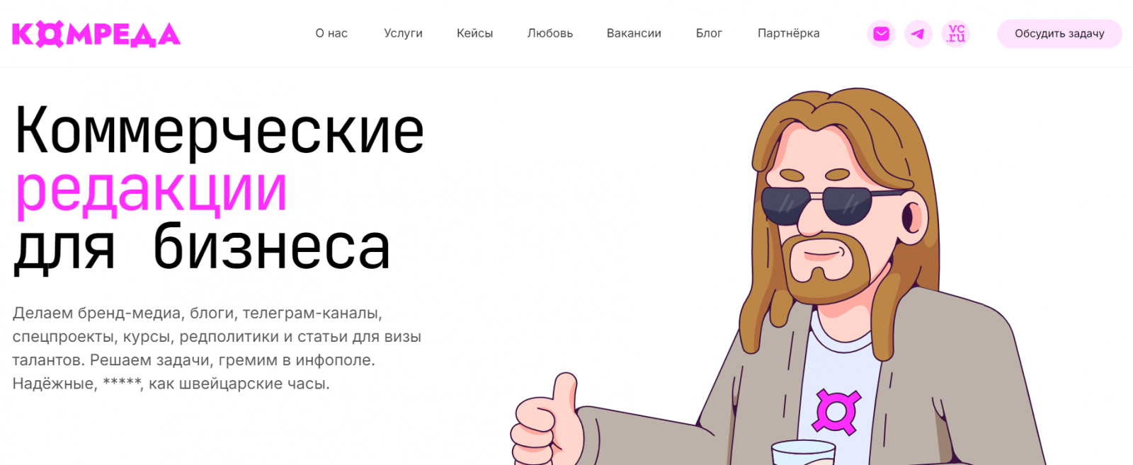 Агентство “Комреда” специализируется на создании и продвижении контента и является частью холдинга SETTERS Creative Capital. Предлагают широкий спектр услуг, включая запуск блогов, Telegram-каналов, бренд-медиа на популярных платформах, а также разработку и продвижение образовательных курсов. Руководитель компании ранее работал в пиар-агентстве из того же холдинга.