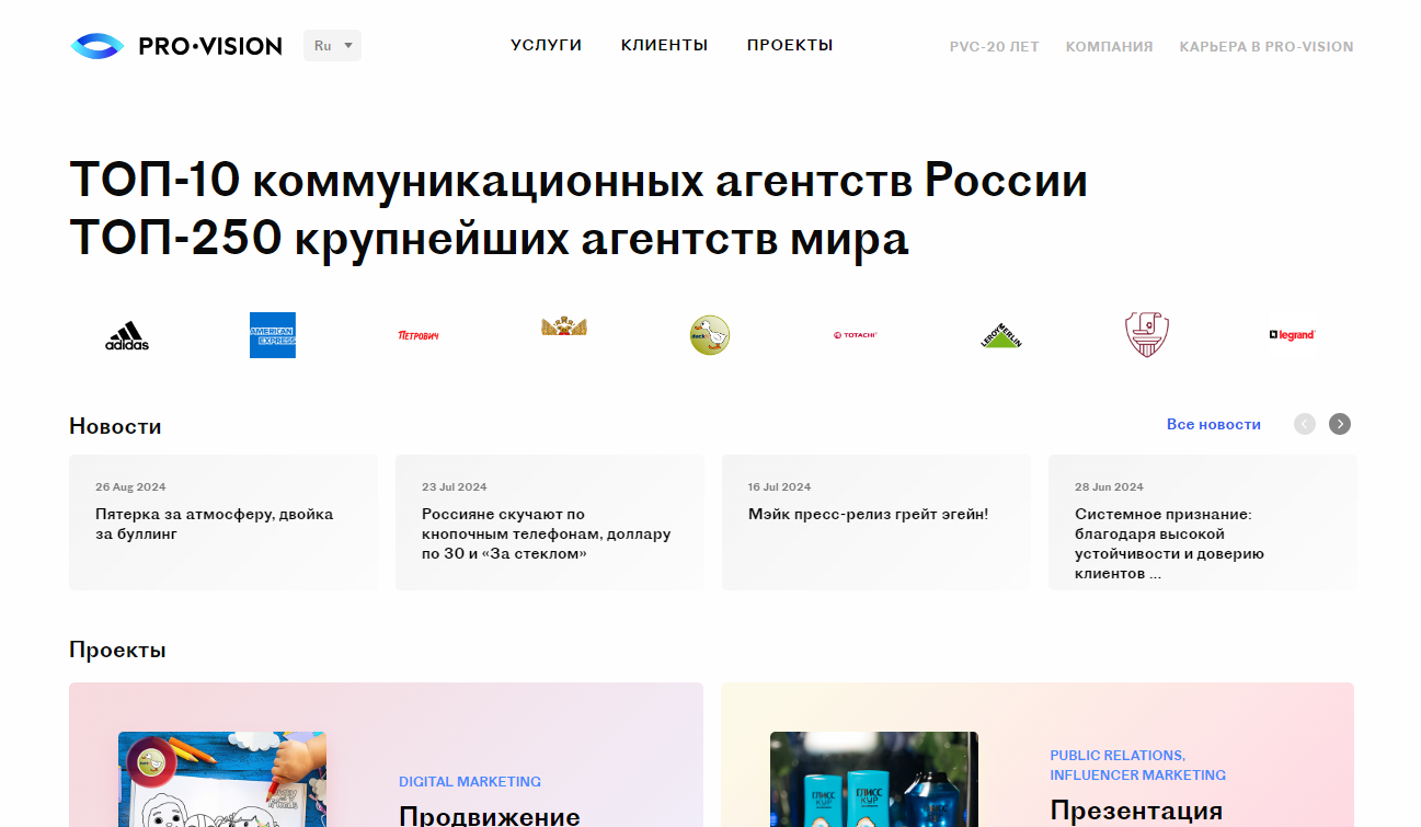 Агентство Pro-Vision работает на рынке уже более 20 лет и входит во множество различных рейтингов. Агентство предоставляет услуги по антикризисным коммуникациям, работе с негативными отзывами и подготовке спикеров к выступлениям перед СМИ. Также Pro-Vision занимается внутрикорпоративным PR, помогая выстраивать эффективную коммуникацию с сотрудниками, развивать корпоративную культуру и управлять имиджем топ-менеджеров. Основатель агентства работает в сфере PR с 1993 года.