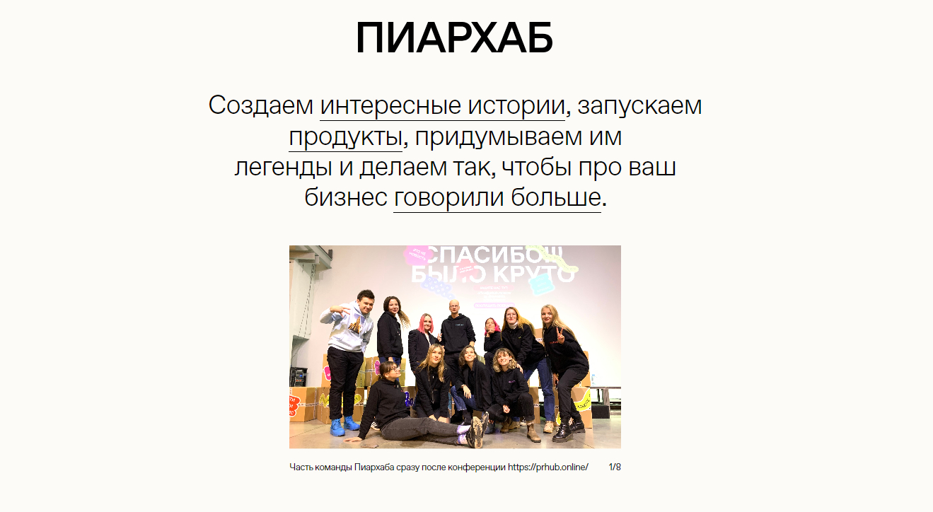 Агентство “ПИАРХАБ” занимается продвижением брендов в медиа — от анализа и разработки стратегических планов до создания информационных поводов и регулярного размещения публикаций. Может взять на себя управления социальными сетями и взаимодействие с блогерами. “ПИАРХАБ” специализируется на проектах из сфер интернет-торговли, финансовых технологий, пищевой индустрии и страхования. Агентство имеем совместное с “Комредой” медиа “Журнал Пиархаба” — журнал про PR.